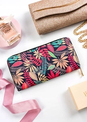 Kolorowy portfel damski w kwiatki piórnik ze skóry ekologicznej beżowy - PTP-01