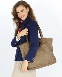 Skórzana pleciona torebka damska shopper beżowy - MARCO MAZZINI v186b