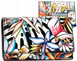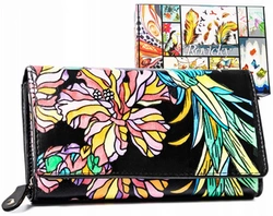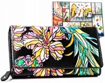 Skórzany portfel damski na zatrzask kolorowy w kwiaty - Rovicky R-N22-ART