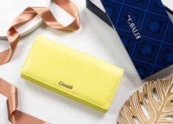 Duży, skórzany portfel damski na bigiel i zatrzask żółty — Peterson KA-23