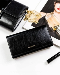 Skórzany portfel damski czarny z klapką na zatrzask - Peterson PL-411