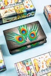Skórzany portfel damski na zatrzask ze wzorem pawich piór kolorowy - Rovicky R-N19-ART