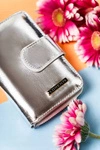 Portfel damski na zatrzask i bigiel z błyszczącej skóry naturalnej srebrny - Lorenti 42329-MER