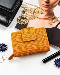 Skórzany portfel damski zamykany na zatrzask żółty - Rovicky R-613-DDW