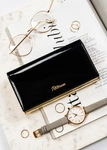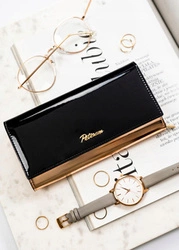 Skórzany portfel damski czarno-złoty z lakierowaną klapką - Peterson 1N-409