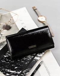 Skórzany portfel damski lakierowany czarny na zatrzask - 4U Cavaldi H24-1-SH9-BL