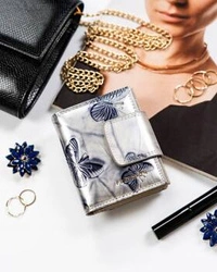 Skórzany portfel damski na zatrzask i bigiel srebrny w motyle - Peterson 421028-BF
