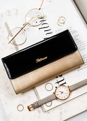 Skórzany portfel damski czarno-złoty z lakierowaną klapką - Peterson 1N-409
