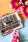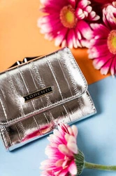 Portfel damski na zatrzask i bigiel z błyszczącej skóry naturalnej srebrny - Lorenti 42329-MER