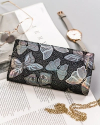 Skórzany kolorowy portfel damski zdobiony niebieskimi motylami — Peterson 42123-ONBF