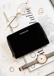 Skórzany lakierowany portfel damski czarny na suwak RFID - Peterson BC-418