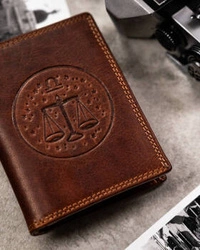 Duży skórzany portfel męski ciemnobrązowy ze znakiem zodiaku waga — Peterson N4-EBS