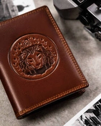 Duży skórzany portfel męski ciemnobrązowy ze znakiem zodiaku lew — Peterson N4-EBS