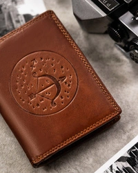 Duży skórzany portfel męski brązowy z wytłoczonym znakiem zodiaku strzelec — Peterson N4-EBS