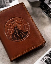 Duży skórzany portfel męski ciemnobrązowy ze znakiem zodiaku panna — Peterson N4-EBS