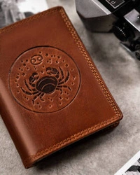 Duży skórzany portfel męski brązowy ze znakiem zodiaku rak — Peterson N4-EBS