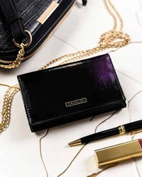 Mała skórzana portmonetka damska na zatrzask i bigiel czarna - Lorenti 55287-CEK