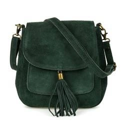 Mała skórzana damska listonoszka zamszowa z klapką ciemnozielona - Vera Pelle X40